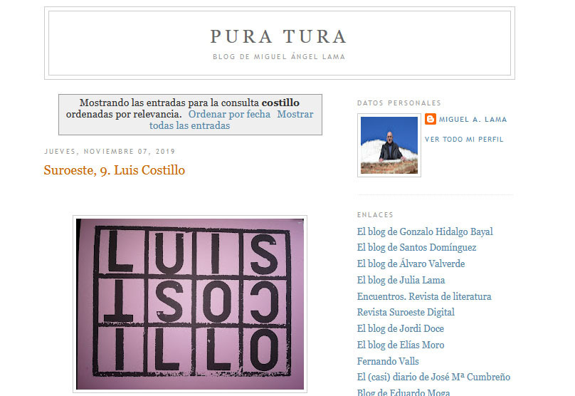 01.05.2019Blog de Miguel Ángel Lama que nos habla del suplemento de la Revista Suroeste en homenaje a Luis Costillo, además, podemos ver todas las noticias que escribió sobre Luis.